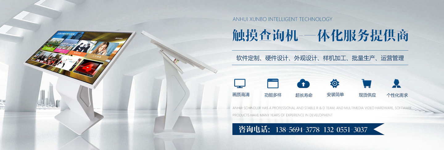 迅博智能 位于中國科教城---合肥市,和經濟開發區與高新區毗鄰,地址合肥市肥西縣湯口路與皋城路交口人民萬福產業園一期12棟東側,是一家IT領域的高新技術企業,全心全意服務于信息化建設,做專業的信息化提供商,全力打造信息時代新模式。 迅博智能 主要從事觸摸屏、觸摸顯示器、OLED柔性觸摸屏、觸摸查詢一體機系列產品及觸摸顯示互動體驗軟硬件產品;智能排隊叫號、網上預約排隊叫號、安康碼皖事通取號系統;曲面屏、OLED 屏幕、柔性屏、LCD液晶大屏拼接系統;落地式、壁掛式單機版網絡版室內外廣告機及數字標牌廣告信息發布系統;室內外LED電子格柵透明屏、單雙色、全彩電子大屏;各類辦事營業廳:公積金...